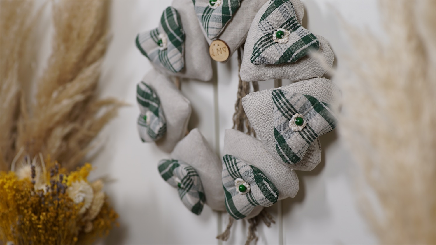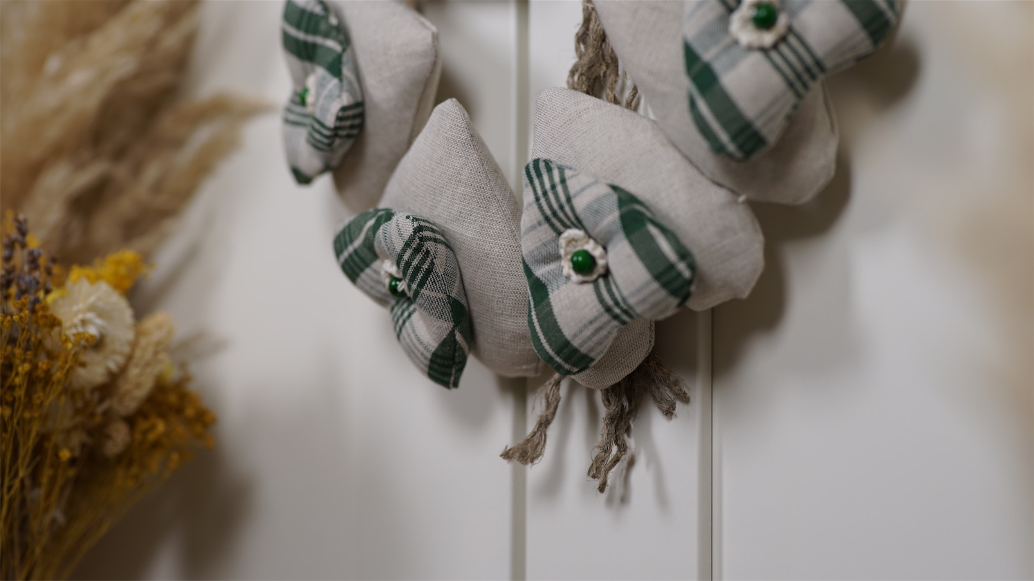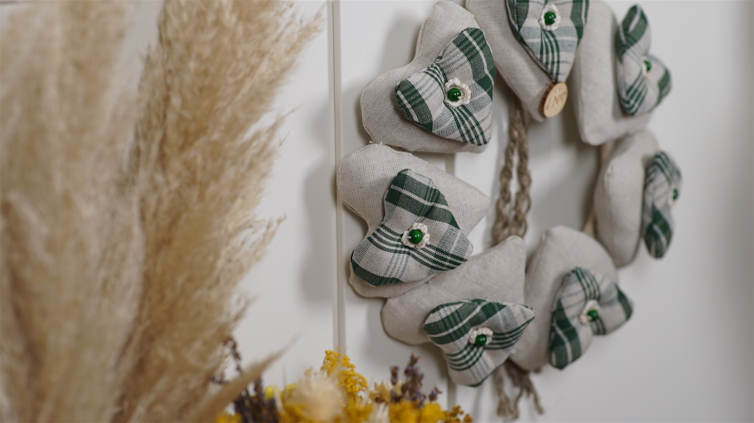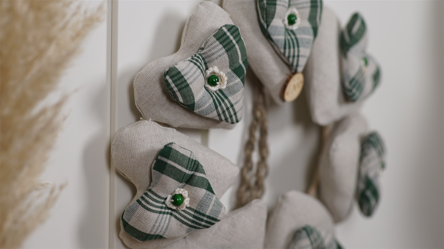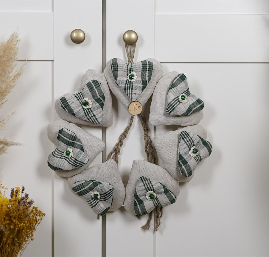 Couronne faite avec 2 tailles de cœurs en keslch, posée sur une table ou accrochée a une porte grâce a son attache , elle suscitera beaucoup de »OH! C’est beau! »