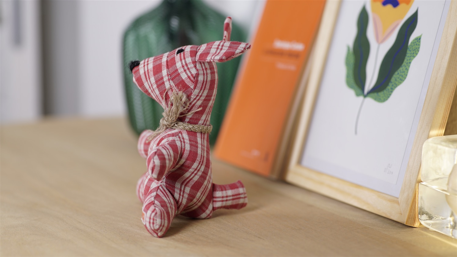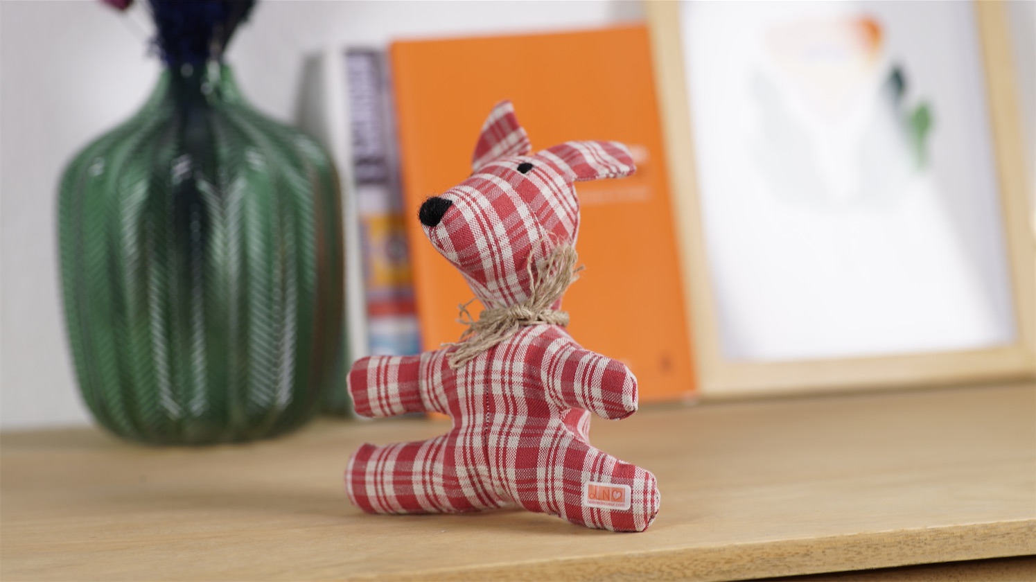 Petit chien en kelsch, confectionné à la main par les bénévoles de l’association. Collier dressé en chanvre.