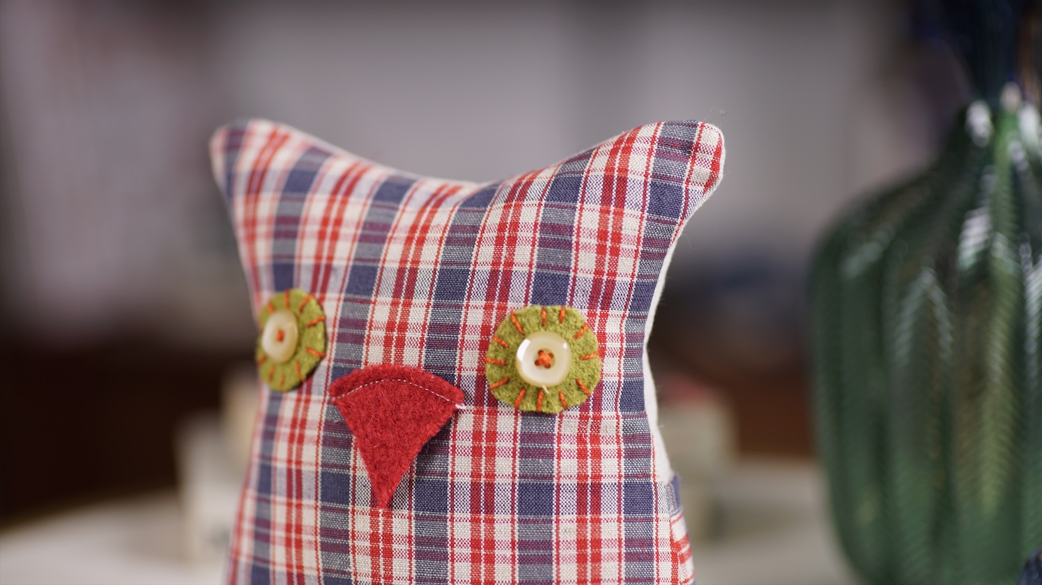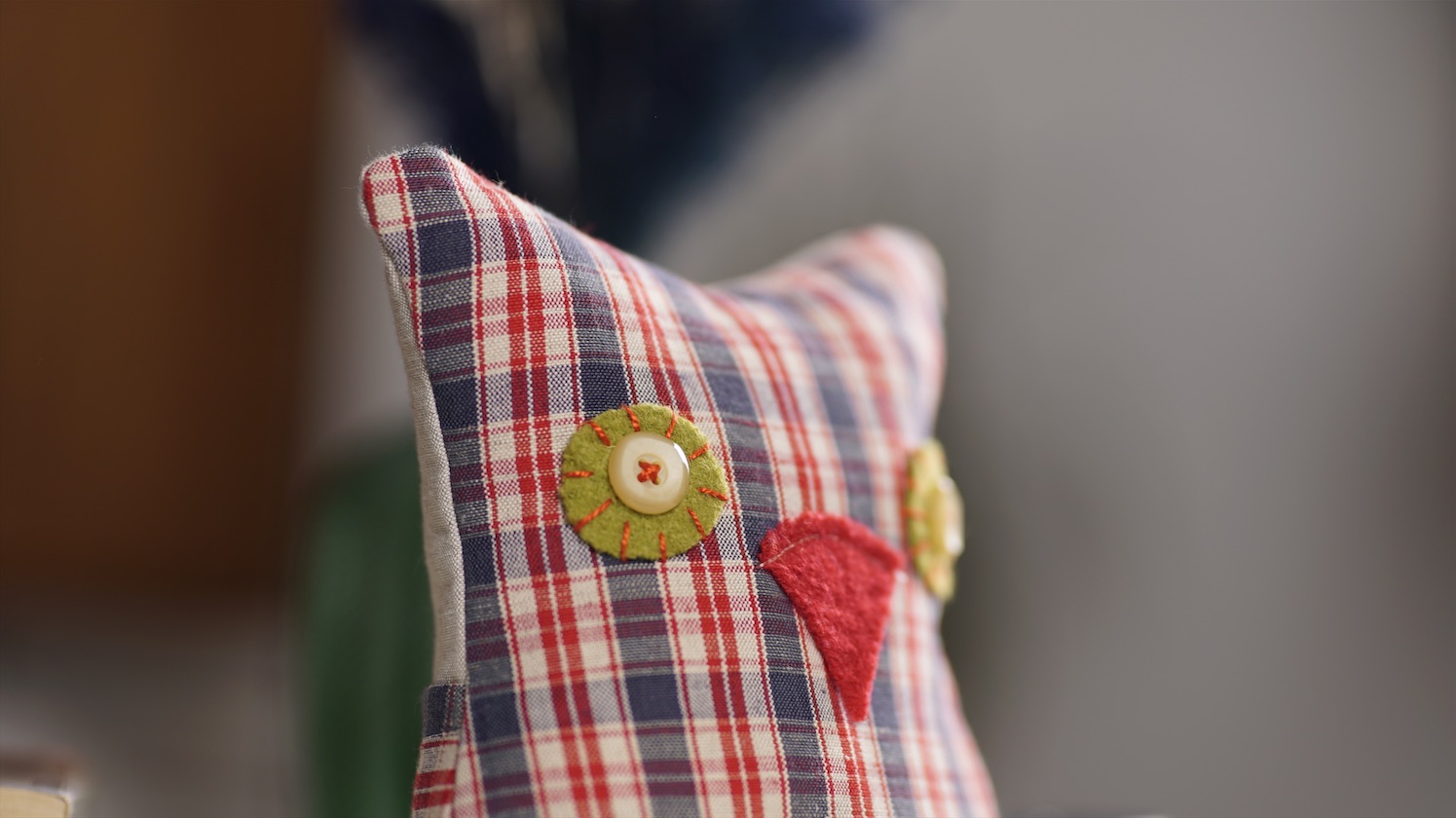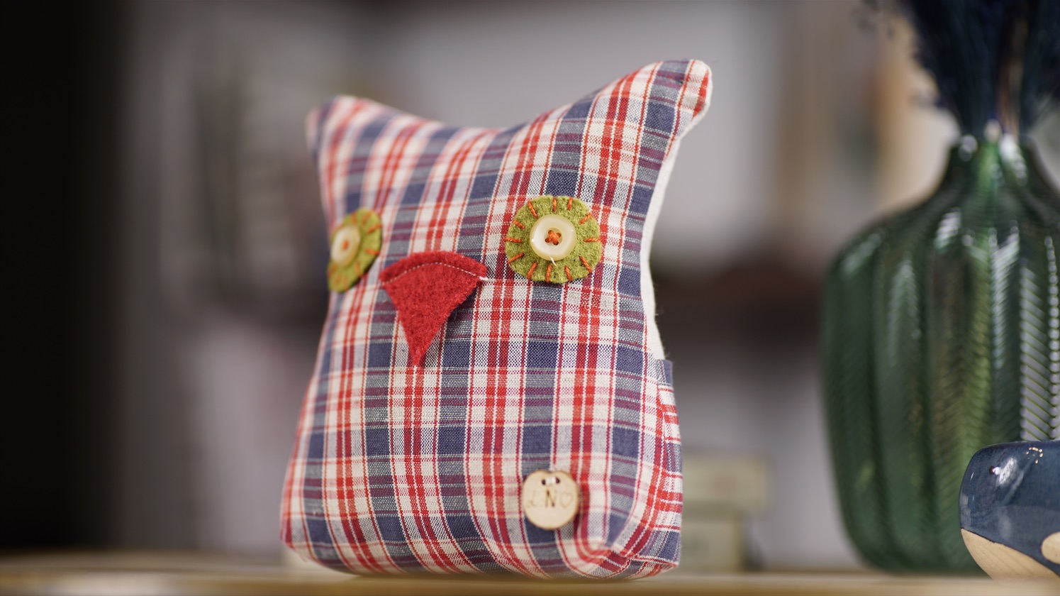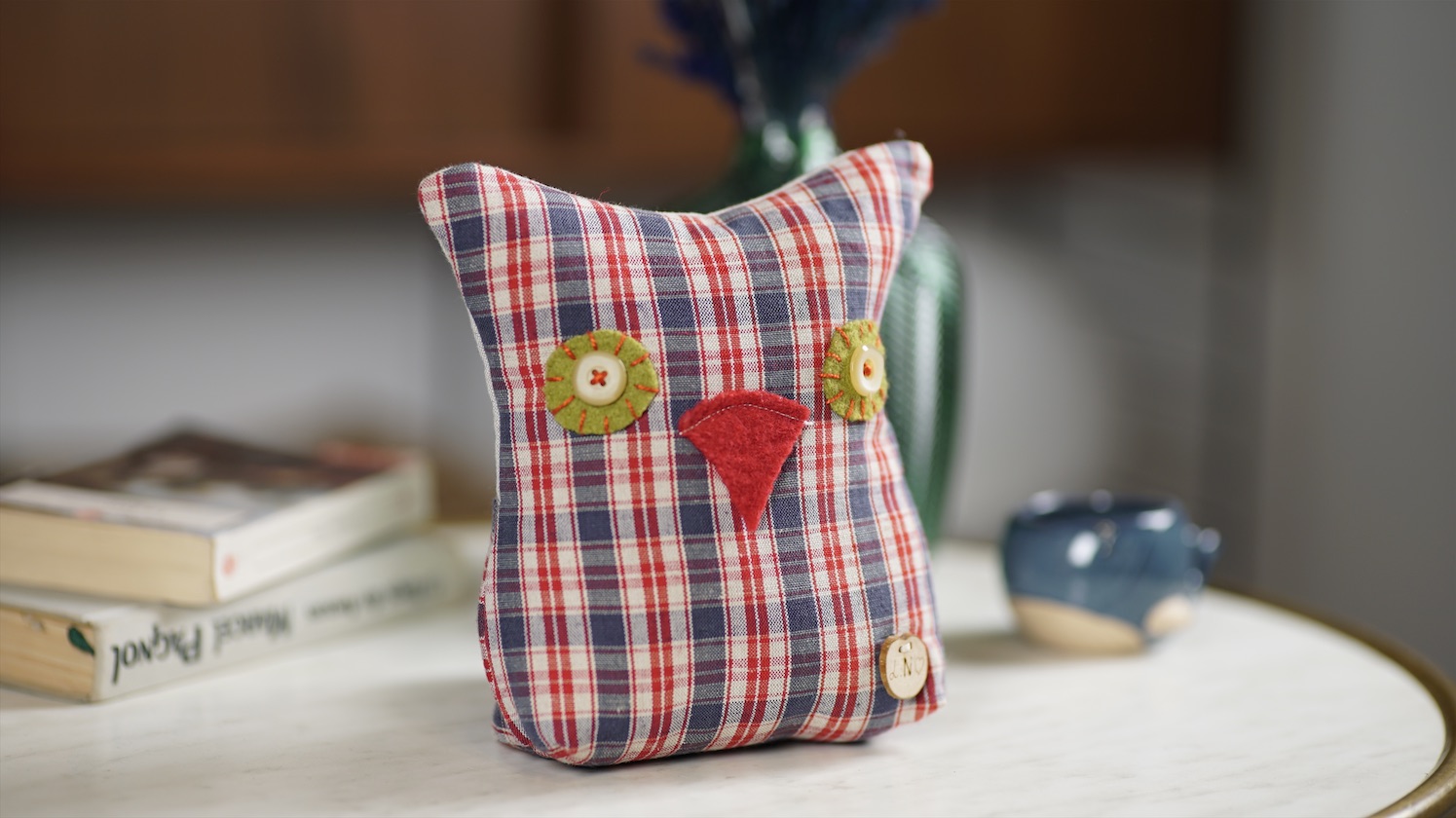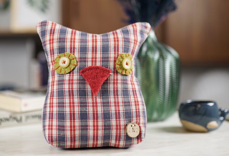 Hibou en kelsch yeux en laine bouillie et boutons, poche au dos pour y ranger doudou, mouchoir, télécommande… objet de décoration confectionné à la main… de l’association.